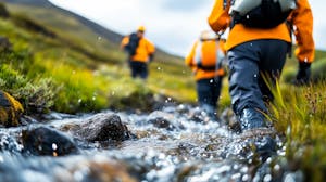 Dedicated scientists traverse a lush, untamed landscape, engaged in vital research amid a vibrant ecosystem. Their commitment to understanding nature fuels this adventurous journey